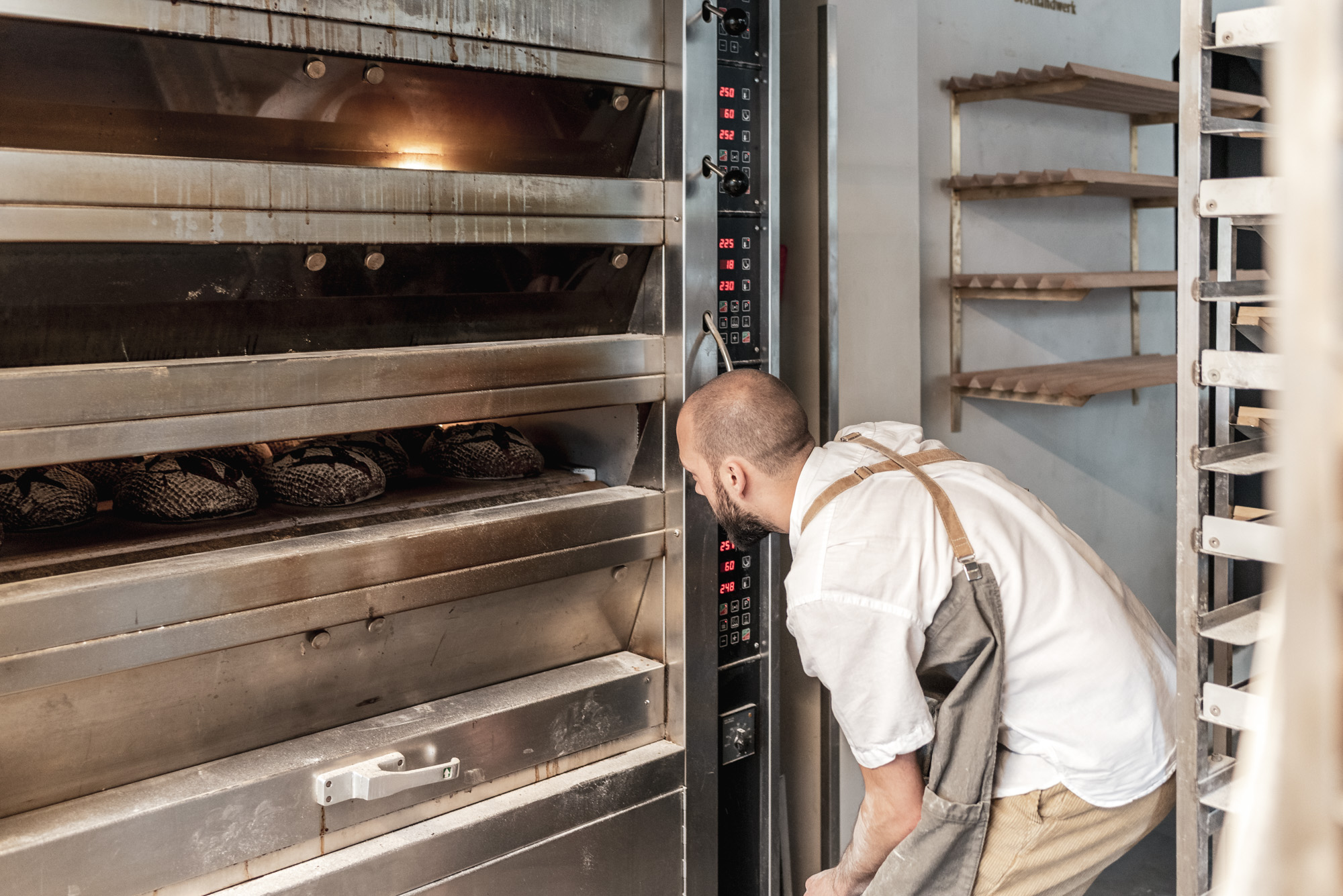 Nichts davon, sagt Julius Brantner, ist in seinem Brot drin und weil er nichts zu verbergen hat, kam er auf die Idee der gläsernen Bäckerei. Die Backstube und der Verkaufsbereich sind in einem kleinen Eckladen untergebracht. Durch drei große Schaufenster kann man dem Bäcker und seinen Angestellten beim Arbeiten zusehen. Kleine Texte beschreiben was an dieser Station gerade passiert und in der Nacht kann man dem Sauerteig zusehen wie er geht.