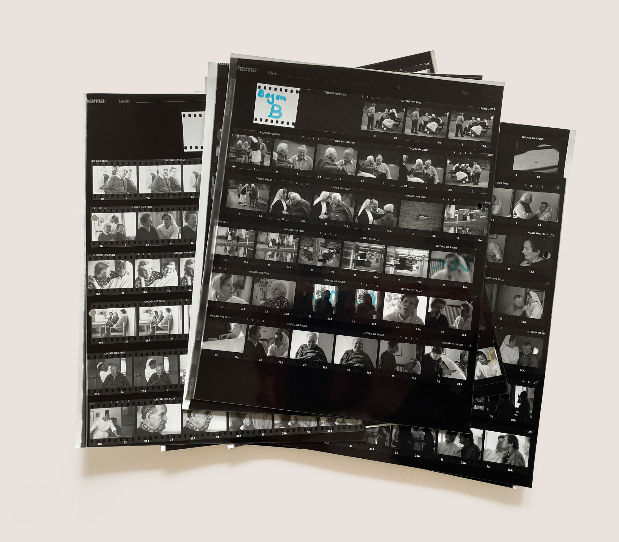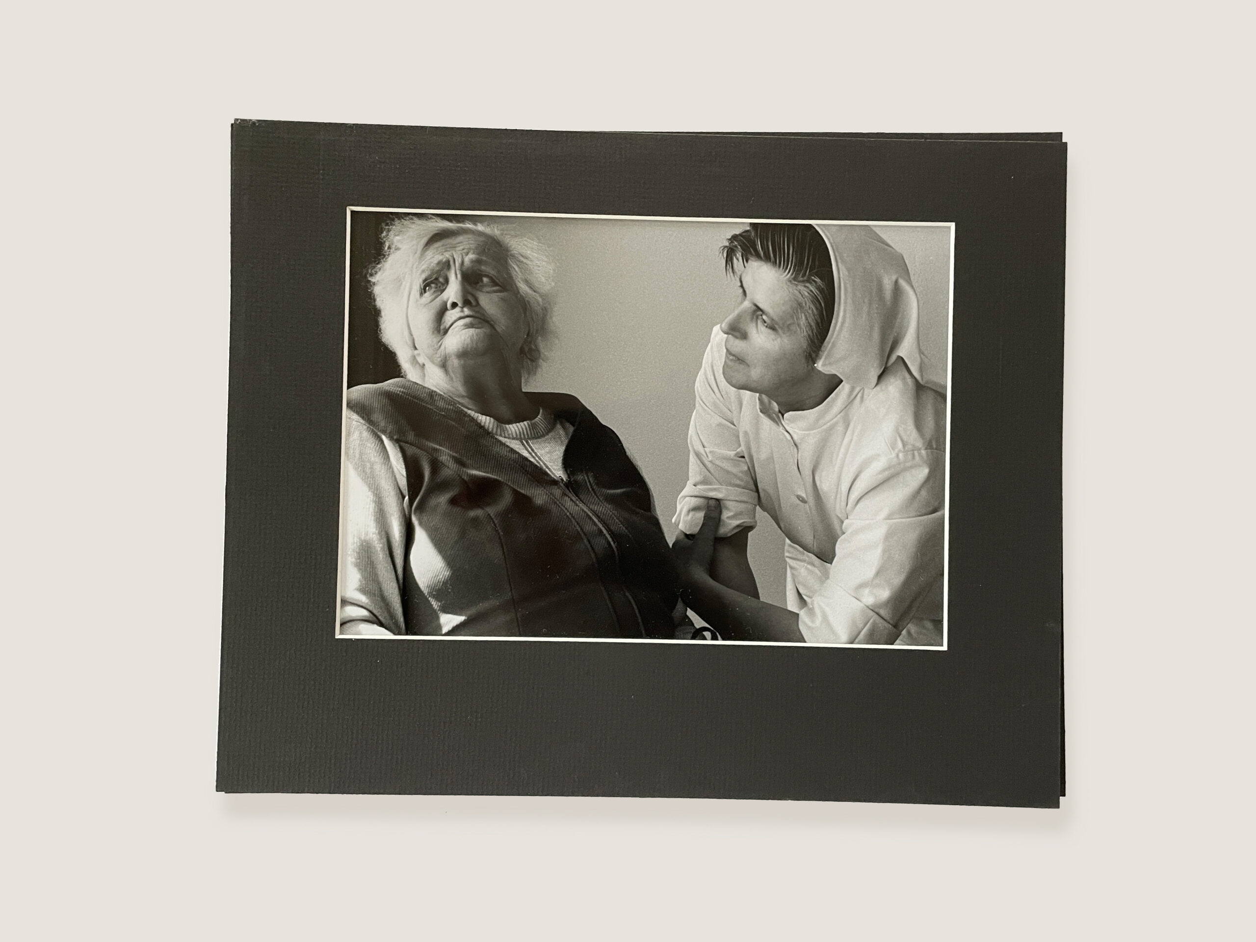 Die Bilder zeigen Betreuerinnen und Betreute in einfachen, ruhigen Situationen. Eine der Pflegerinnen, eine Nonne, die meine Großmutter bis zuletzt begleitet hatte, ist auf drei der Fotografien zu sehen.