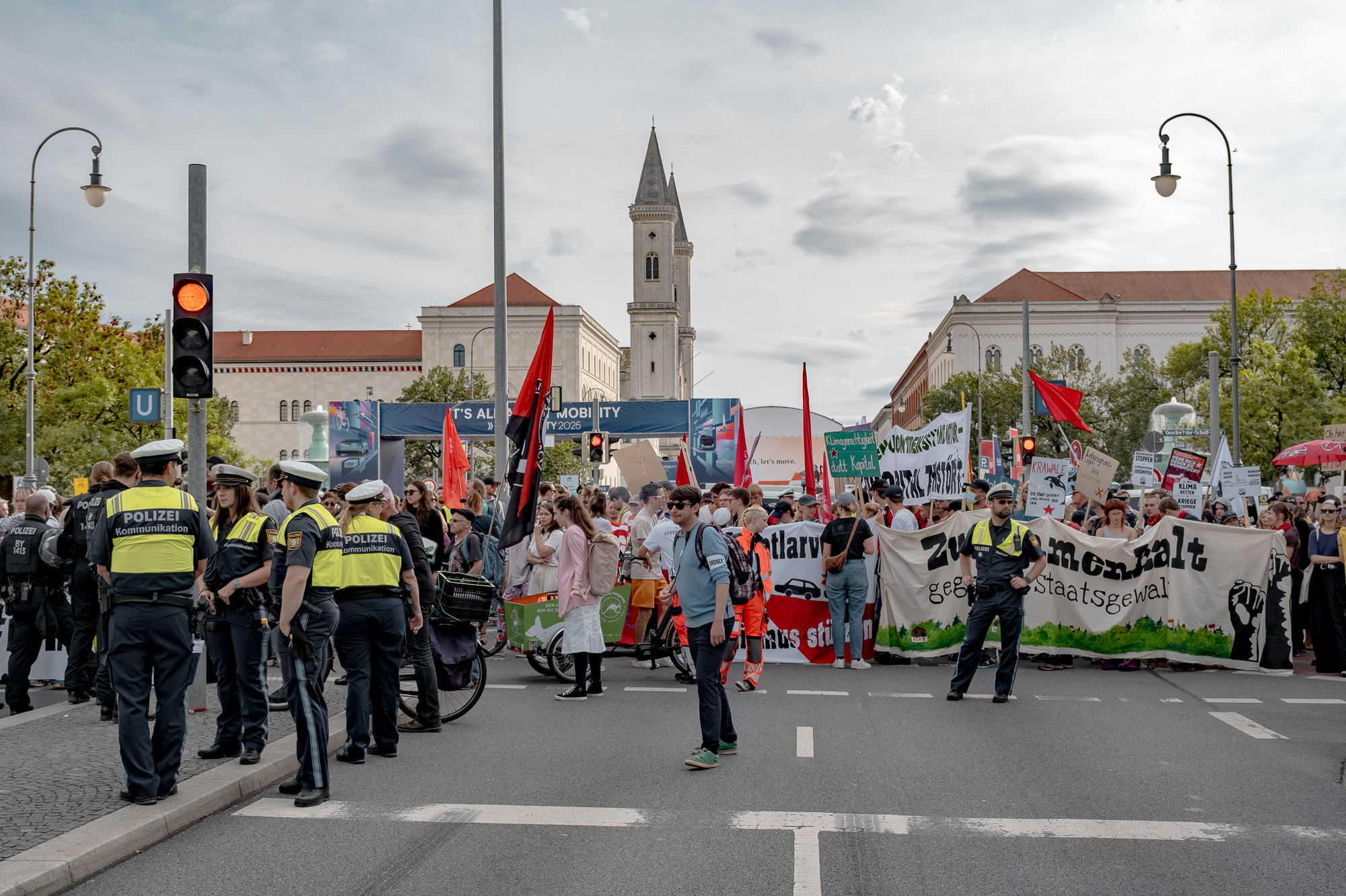 Anlässlich der IAA 2025 kam es in München zu mehreren Protestaktionen. Am 9. September blockierten Aktivist:innen des „Widerstands-Kollektivs“ die Donnersberger Brücke vor dem Mercedes-AMG-Center, mehrere Personen klebten sich auf die Fahrbahn fest, der Verkehr war bis zum Vormittag erheblich beeinträchtigt. Am 11. September folgte eine Autobahnblockade auf der A9 bei der Allianz Arena: Aktivist:innen besetzten die Fahrbahn und kletterten auf eine Schilderbrücke, wodurch es zu einem mehrkilometrigen Stau kam. Ebenfalls am 11. September inszenierte Extinction Rebellion ein „Die-In“ am Odeonsplatz und zog damit Aufmerksamkeit von zahlreichen Passant:innen auf sich. Am 12. September zeigte BMW zwei Personen wegen Hausfriedensbruchs an, nachdem diese mit Bobbycars eine Rampe zur Tiefgarage der BMW-Welt hinuntergefahren waren. Am Samstag Nachmittag fand die IAA-Demo statt. Es kamen deutlich weniger Teilnehmer:innen als in den vergangenen Jahren.
